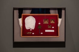 In this work, Belinda Kazeem-Kamiński concentrates on items that were assigned to Soliman during his lifetime (ante mortem) and after his death (post mortem). But this diptych does not simply show the display cases containing Soliman’s props: both photographs also feature two arms, with white gloves and black sleeves, that hold the cases, evoking the figure of the custodian or restorer. In creating this effect of “a frame within a frame”, the work insists on the museal apparatus and its relentless logics of collecting, preserving, and exhibiting.